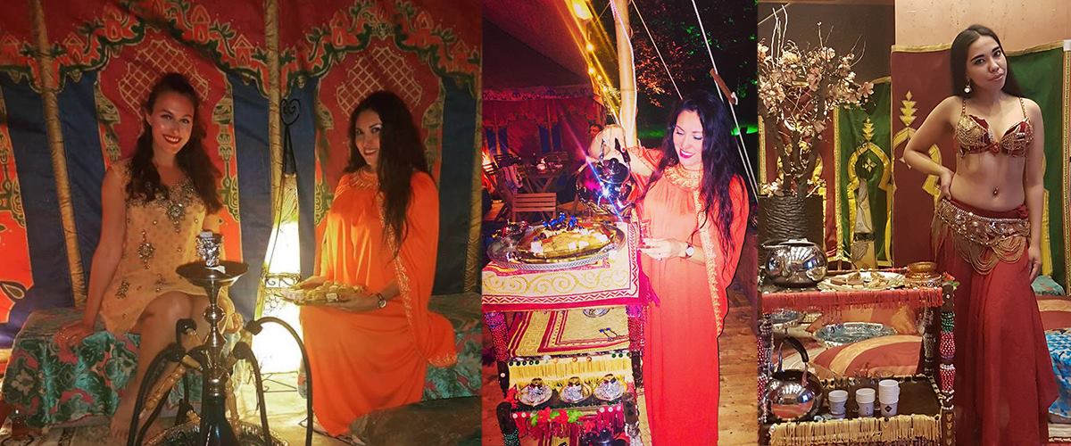 Bij binnenkomst kunnen de gasten met Oosterse vrouwen, met slang op arm, op de foto. Deze dames zijn de hele avond aanwezig; gasten kunnen met de dames op de foto. Na het eten verkleden de dames zich (indien nodig) en geven ze een buikdansoptreden op het podium. Daarna, of tijdens het eten, zal een vuurshow gegeven worden.De Shisha-hoek is gedurende de hele avond beschikbaar.
